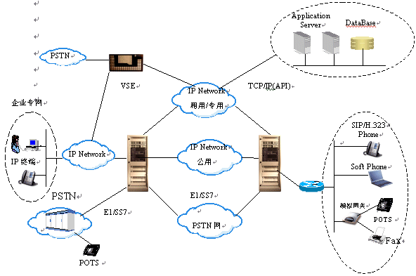 ESE/VSE作為電路到IP的接入網(wǎng)關,可提供PSTN與IP網(wǎng)的互通。做為軟交換機,可建設全IP方式的電話網(wǎng)絡,并實現(xiàn)呼叫處理,路由,業(yè)務實現(xiàn)等功能。