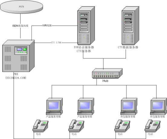 Siemens Hicom318.com交換機:接入ISDN中繼線,設置人工座席分機,為CTI,IVR語音服務器提供16路IVR端口和CTI LINK控制電纜。