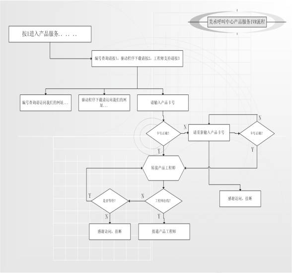 IVR系統(tǒng)是呼叫中心系統(tǒng)中極為重要的一環(huán)。作為面向用戶的窗口,IVR的語音交互方式引導用戶進入不同的業(yè)務流程,聽取相關信息。清晰,流暢,禮貌而又有層次的IVR語音會給用戶留下深刻的印象。美承的IVR系統(tǒng)在設計上參照了其他成功的客服中心的經驗,充分考慮了用戶的習慣,在流程上具有鮮明的特點,以下以產品服務為例: