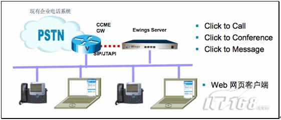 點點通系統(tǒng)配置一臺CISCO 2811集成多業(yè)務路由器設備,能提供CCME IP電話的支持,并且可以跟企業(yè)內(nèi)部的現(xiàn)有電話系統(tǒng)對接。另外,點點通系統(tǒng)還有一臺服務器,這是思科的合作伙伴提供的硬件和軟件,通過它實現(xiàn)和公司目錄的集成和各種對電話的控制功能。這臺服務器和CCME之間采用SIP或JTAPI的連接。