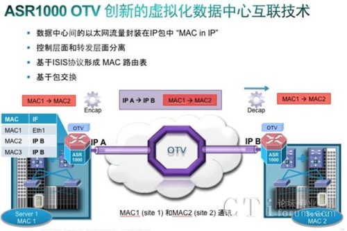 Cisco OTV技術(shù)可以為跨任意傳輸網(wǎng)絡(luò)的二層連接擴(kuò)展,提供運(yùn)營優(yōu)化型解決方案。因此,OTV對于分布式數(shù)據(jù)中心的高效部署發(fā)揮著關(guān)鍵作用,有助于實(shí)現(xiàn)應(yīng)用可靠性和靈活的工作負(fù)載遷移。OTV是一項(xiàng)“MAC in IP”技術(shù)。通過使用MAC地址路由規(guī)則,OTV可提供一種疊加(overlay)網(wǎng)絡(luò),能夠在分散的二層域之間實(shí)現(xiàn)二層連接,同時保持這些域的獨(dú)立性以及IP互聯(lián)的容錯性、永續(xù)性和負(fù)載均衡優(yōu)勢。 圖1說明了這種工作機(jī)制。
