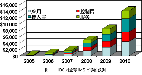IMS作為一個通信架構,開創(chuàng)了全新的電信商業(yè)模式,拓展了整個信息產(chǎn)業(yè)的市場空間。IMS正在成為新一輪的投資熱點。IDC認為,IMS市場將從目前的數(shù)百萬美元迅速增長到2010年的141億美元(如圖1)。對于電信行業(yè)來說,IMS的意義甚至超出了3G或4G,它將重新定義未來的通信業(yè)務。