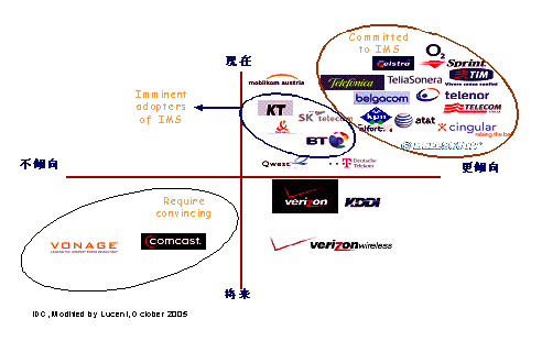 朗訊IMS融合解決方案的優(yōu)勢決定了其市場的領導地位,截至2006年24月,朗訊在全球已簽約77個IMS商用合同和77個試驗合同。尤其是北美五大運營商(Cingular、Sprint、at&t、BellSouth、Verizon)中有4個已經(jīng)與朗訊簽訂了IMS 商用合同,而且朗訊目前正積極配合Verizon進行IMS網(wǎng)絡測試。歐洲運營商Netia和O2也與朗訊簽訂了IMS商用合同。Yankee稱這些合同,特別是北美四大運營商簽訂的合同,奠定了朗訊作為有線和無線領域全球領先IMS供應商的地位。另外,根據(jù)最近 Yankee集團的IMS調(diào)查,朗訊在IMS領域有著絕對的領先優(yōu)勢,在技術和試驗網(wǎng)上都優(yōu)越于競爭對手。