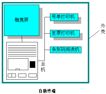 自助終端的結(jié)構(gòu)主要分為6個(gè)部分:主機(jī)、觸摸屏、條形碼閱讀機(jī)、號(hào)單打印機(jī)、發(fā)票打印機(jī)和外殼。