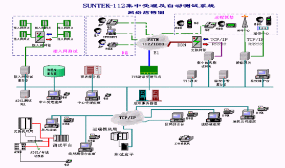 系統(tǒng)在設(shè)計(jì)時(shí)采用集中受理、分布測(cè)量的結(jié)構(gòu)化、模塊化設(shè)計(jì):受理中心進(jìn)行112的集中受理和業(yè)務(wù)處理,端局完成相應(yīng)用戶線的測(cè)試功能,所有測(cè)試數(shù)據(jù)等均送至受理中心。系統(tǒng)測(cè)試準(zhǔn)確、任務(wù)分擔(dān)、負(fù)荷均衡,處理速度快,性能可靠。系統(tǒng)的受理模塊和測(cè)試模塊相互協(xié)調(diào)又各自獨(dú)立,使二者可以統(tǒng)一地作為SUNTEKTM-112集中受理及自動(dòng)測(cè)試系統(tǒng),又能各自作為子系統(tǒng)與其它廠家(112系統(tǒng)、97系統(tǒng)、1000號(hào)等)的產(chǎn)品結(jié)合起來為112系統(tǒng)服務(wù)。系統(tǒng)網(wǎng)絡(luò)結(jié)構(gòu)圖如下所示: