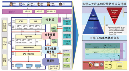 在企業(yè)應(yīng)用集成上,產(chǎn)品采用了面向服務(wù)的組件化設(shè)計(jì),遵循SOA體系架構(gòu),既支持基于服務(wù)的企業(yè)IT系統(tǒng)在數(shù)據(jù)、服務(wù)、流程等各個(gè)層面有效協(xié)同,也支持對各種遺留系統(tǒng)采用各種傳統(tǒng)的接口方式進(jìn)行集成。