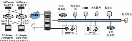 系統(tǒng)整體采用集中式架構(gòu),呼叫中心平臺(tái)采用東進(jìn)公司基于Yessoe技術(shù)開(kāi)發(fā)的Seegoe多媒體交換機(jī)和Seegoe通信服務(wù)器。呼叫中心平臺(tái)與物流公司內(nèi)部的物流管理系統(tǒng)(如LM、SCM)通過(guò)TCP/IP進(jìn)行結(jié)合。呼叫中心系統(tǒng)具有豐富的媒體資源和強(qiáng)大的處理能力,并提供功能模塊的N+1全冗余備份,滿足了高負(fù)荷、大并發(fā)和關(guān)鍵業(yè)務(wù)的可靠運(yùn)營(yíng)。其次,Seegoe呼叫中心平臺(tái)在媒體交換層以全新的IP架構(gòu)實(shí)現(xiàn)網(wǎng)絡(luò)融合、應(yīng)用融合和業(yè)務(wù)融合,能夠很好的滿足電視購(gòu)物行業(yè)對(duì)呼叫中心的要求。
