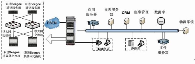 東進(jìn)技術(shù)電視購(gòu)物呼叫中心解決方案,采用東進(jìn)技術(shù)Seegoe系列多媒體交換機(jī)和多媒體服務(wù)器搭建系統(tǒng)平臺(tái)。東進(jìn)Seegoe系列多媒體交換機(jī),具有豐富的媒體資源和強(qiáng)大的處理能力,并提供功能模塊的N+1全冗余備份,滿足了高負(fù)荷、大并發(fā)和關(guān)鍵業(yè)務(wù)的可靠運(yùn)營(yíng)。以Seegoe多媒體交換機(jī)、Seegoe通訊服務(wù)器為核心的面向業(yè)務(wù)流程的呼叫中心平臺(tái)在媒體交換層以全新的IP架構(gòu)實(shí)現(xiàn)網(wǎng)絡(luò)融合、應(yīng)用融合和業(yè)務(wù)融合。如下圖所示: