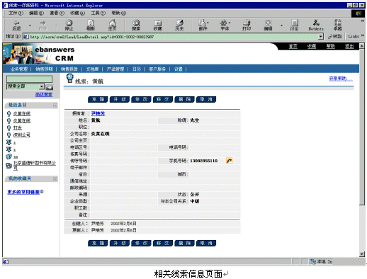 Ebanswers CRM系統(tǒng)去激活相關(guān)客戶資料的IE頁面進行處理:如果此號碼數(shù)據(jù)庫中存在,則顯示此人的信息,如果不存在,則顯示CRM中添加新線索的頁面。而Ebanswers