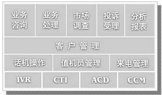 從技術(shù)實(shí)現(xiàn)的角度,劃分為四層。依次為呼叫中心系統(tǒng)層,應(yīng)用管理層、客戶(hù)管理層和業(yè)務(wù)應(yīng)用層。