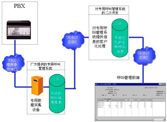 一般來說,各大有能力推出PBX產(chǎn)品的通訊廠商都有自己專用的呼叫管理系統(tǒng)。這些專用的呼叫管理系統(tǒng)可以直接從PBX獲取最高效的消息,而不用通過CTI SERVER。當(dāng)然,這些專用的呼叫管理系統(tǒng)也只能應(yīng)用于專門的PBX產(chǎn)品。 如果運(yùn)營商在選購設(shè)備的時(shí)候,已經(jīng)選購了專用的呼叫管理系統(tǒng),那么開發(fā)商可以對(duì)這個(gè)專門的呼叫管理系統(tǒng)進(jìn)行二次開發(fā)。請(qǐng)看下面的數(shù)據(jù)流程圖: