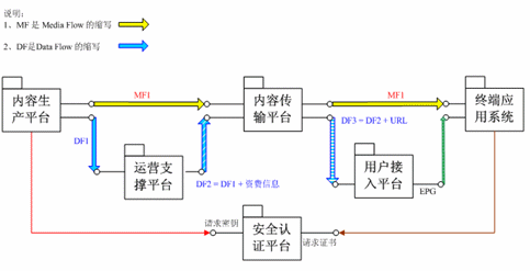 系統(tǒng)根據(jù)功能可分成內(nèi)容制作、節(jié)目傳輸、安全認(rèn)證、計(jì)費(fèi)營(yíng)業(yè)、接入處理和終端六個(gè)部分。整個(gè)系統(tǒng)始終貫穿媒體流和數(shù)據(jù)流,確保各個(gè)部分能夠有效的協(xié)作。
