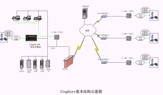 硬件:坐席集中的中心點都有ZingSwitch®交換機,S口網(wǎng)關和CO8卡或E1接口網(wǎng)關和E1卡。VPN動態(tài)注冊服務器和VPN設備,或GK服務器。