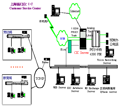 中心的具體功能包括語音自動應答IVR、座席端應用、網上服務、文本語音轉換TTS、傳真FAX、語音留言和報表等。一期工程開通服務的有技術監(jiān)督、教育、勞動、民防、司法和招商中心等六部門。