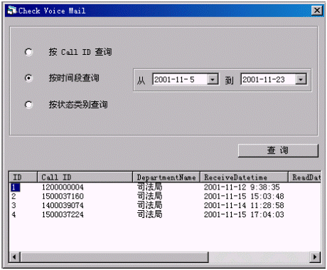 用戶電話進入中心,并轉至坐席,此時如果坐席處于忙或非工作時間,中心會自動提示用戶留言,留言后坐席在一定的時間內給予回復處理,并在處理的同時對所有的語音留言Voice Mail做狀態(tài)分類統(tǒng)計。中心還對用戶留言的處理過程進行跟蹤,以便防止大量語音留言不能得到及時處理,影響中心的服務質量。