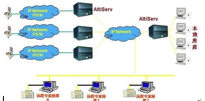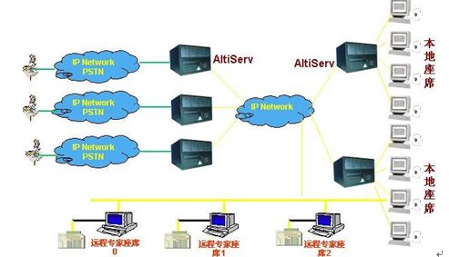 這種組合節(jié)省管理成本,因為所有的座席員都在一點,便于管理控制,同時用戶只要撥打本地電話即可進入系統(tǒng)接收服務(wù),如需人工座席應(yīng)答的話系統(tǒng)會自動將來電通過Internet轉(zhuǎn)接到座席員處,對公司的話費成本也較低(都是通過Internet實現(xiàn)的長途轉(zhuǎn)接功能)。同時AltiGen也支持通過IP分機的方式遠程登錄到系統(tǒng)實現(xiàn)遠程座席的功能,這樣對有些高級話務(wù)員或?qū)<易,不必每天到公司上班,可以通過家里的電腦登錄到AltiGen系統(tǒng),作為系統(tǒng)的一個分機來完成所有的座席員的功能,在他的電腦屏幕上也能彈出來電人的信息。系統(tǒng)的組網(wǎng)圖如下: