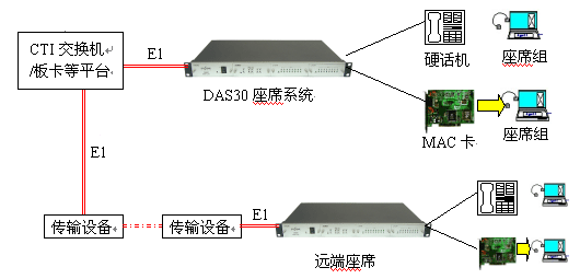 見下圖:DAS30通過1個(gè)E1接口與交換機(jī)/板卡直接連接,無(wú)需配置數(shù)據(jù),可方便地實(shí)現(xiàn)本地座席接入或遠(yuǎn)端分布式接入(需配合傳輸設(shè)備)。終端可為普通電話機(jī)或MAC座席電話卡。