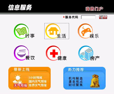 在上海IPTV提供的業(yè)務(wù)中,信息服務(wù)也是眾多用戶喜聞樂見的一項(xiàng)業(yè)務(wù),內(nèi)容覆蓋廣泛。它提供了時事、生活、娛樂、餐飲、健康、房產(chǎn)等信息,其中“時事”一欄呈現(xiàn)了新浪上海熱線實(shí)時傳遞的全球最新新聞資訊,讓老百姓“手握遙控器,便知天下事”,“健康”一欄更是一網(wǎng)打盡上海地區(qū)醫(yī)療機(jī)構(gòu)的信息資訊,特色專科搜索為用戶提供便捷的醫(yī)療信息服務(wù),“房產(chǎn)”中上海地區(qū)各類二手房產(chǎn)訊息一應(yīng)俱全,價(jià)格、地段、房型等應(yīng)有盡有。