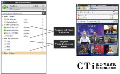 RMX 虛擬會(huì)議室出現(xiàn)在 Office Communicator 2007 聯(lián)系人列表上,用戶點(diǎn)擊即可加入多點(diǎn)通話。這樣, 商業(yè)用戶就可以在 PC 和高品質(zhì)視頻終端上輕松開(kāi)展協(xié)作,并保持與各方隨時(shí)溝通。