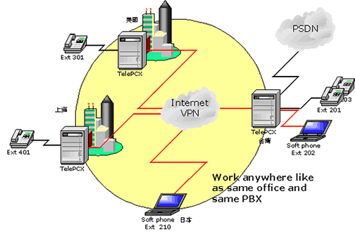 TelePCX支持集成性的VoIP Gateway,可以將交換機(jī)的功能特性,透過互聯(lián)網(wǎng)來延伸。