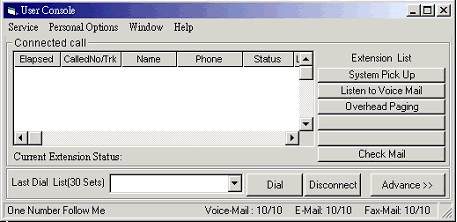 TelePCX 提供屏幕電話使用界面(User Console),提供每一個(gè)分機(jī)使用者一個(gè)GUI的計(jì)算機(jī)操控畫面,無論電話進(jìn)線時(shí)的聲響提示,Caller ID實(shí)時(shí)顯示以及完整的電話控制,從應(yīng)答,撥號,轉(zhuǎn)接乃至各種復(fù)雜的功能設(shè)置如:電話會議(多方通話)、多線電話跳接、通話中聯(lián)機(jī)實(shí)時(shí)錄音……等,均可經(jīng)由點(diǎn)按鼠標(biāo),由計(jì)算機(jī)上的畫面做實(shí)時(shí)的控制,不必記憶復(fù)雜的操作步驟或查詢使用手冊,方便簡易。
