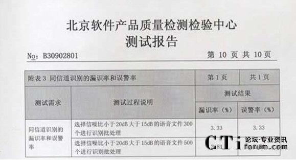 CTI論壇(ctiforum)06月25日消息: 2009年3月02-10日:北京軟件產(chǎn)品質(zhì)量檢測(cè)檢驗(yàn)中心對(duì)《海量語音文件的目標(biāo)說話人篩選系統(tǒng)》進(jìn)行了全面測(cè)試包括用戶文檔、功能性、可靠性、易用性、可維護(hù)性等多個(gè)特性。測(cè)試結(jié)果表明《海量語音文件的目標(biāo)說話 2009年3月02-10日,北京軟件產(chǎn)品質(zhì)量檢測(cè)檢驗(yàn)中心對(duì)《海量語音文件的目標(biāo)說話人篩選系統(tǒng)》進(jìn)行了全面人篩選系統(tǒng)》滿足軟件相關(guān)國家標(biāo)準(zhǔn)中的要求,系統(tǒng)在模擬測(cè)試環(huán)境中運(yùn)行正常、穩(wěn)定,正式通過北京軟件產(chǎn)品質(zhì)量檢測(cè)檢驗(yàn)中心的嚴(yán)格測(cè)試,系統(tǒng)的漏識(shí)率和誤警率分別達(dá)到了2.81%和 2.81%。