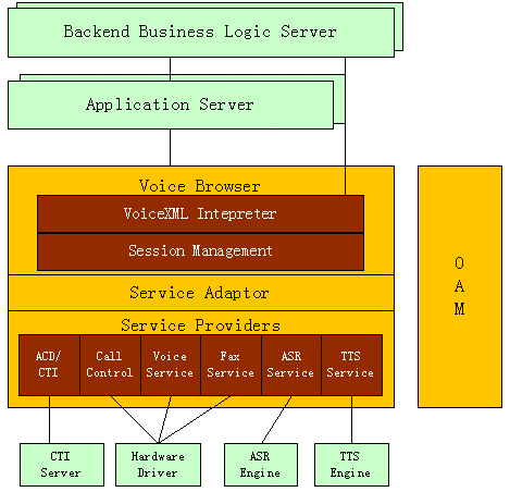 o 功能豐富:支持VoiceXML 2.0的全部現(xiàn)有功能,支持主流PBX、CTI中間件、語音呼入\出、傳真等功能,支持語音識(shí)別(ASR)和語音合成技術(shù)(TTS)。