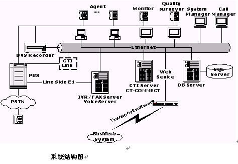 交換機(jī)實(shí)現(xiàn)電話呼入、呼出功能;還需要提供自動(dòng)排隊(duì)機(jī)系統(tǒng),用于實(shí)現(xiàn)對來話的均衡分配;呼叫管理系統(tǒng),用于有效管理所有話務(wù);支持IVR;提供CTI Link模塊作為計(jì)算機(jī)/電話集成接口;同時(shí),交換機(jī)還可作為辦公電話交換機(jī)使用,系統(tǒng)可支持多家公司的交換機(jī)。