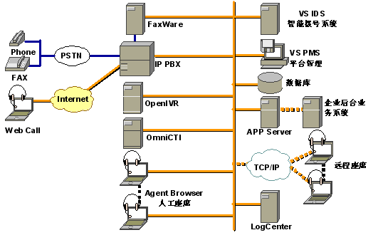 根據(jù)上述幾點(diǎn),上海聲軟網(wǎng)絡(luò)技術(shù)有限公司(www.voicesoft.cn)的CommSuites for IPCC系統(tǒng)就是就是專(zhuān)門(mén)為中小企業(yè)量身定制的的IP呼叫平臺(tái),CommSuites采用3COM的IP交換機(jī)NBX交換機(jī)為通信接入子系統(tǒng),結(jié)合CommSuites的CTI中間件,組成功能完善的IP呼叫中心平臺(tái),下面是CommSuites for IPCC系統(tǒng)結(jié)構(gòu)圖: