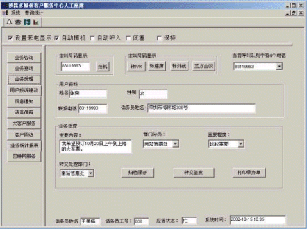 本鐵路客戶服務(wù)中心系統(tǒng)具有售票處/代售點(diǎn)等咨詢、列車(chē)信息等查詢、定票/退票/改票等業(yè)務(wù)受理、用戶投訴與建議、車(chē)次調(diào)整/貨物到站等信息自動(dòng)通知、客戶回訪與滿意度調(diào)查、語(yǔ)音信箱留言服務(wù)以及系統(tǒng)綜合管理等全方位功能;并且結(jié)合圖形化的管理、監(jiān)控界面,使得廣大旅客隨時(shí)隨地可以利用身邊的各種通訊工具享受到鐵路部門(mén)提供的各種信息服務(wù)。