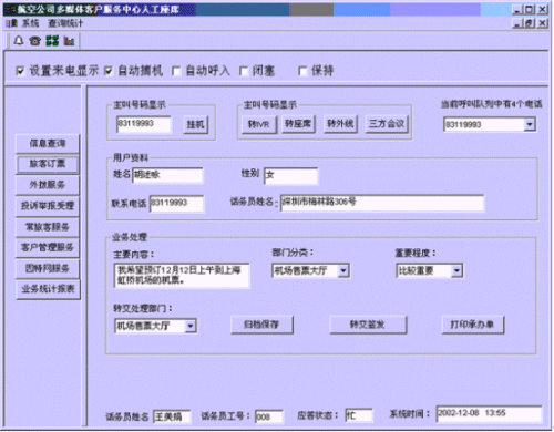 。。提供電話、傳真、電子郵件、因特網(wǎng)、手機(jī)、網(wǎng)絡(luò)電話等多種通訊方式接入和呼出,全天候24小時服務(wù);無論以何種方式接入系統(tǒng),都可以用統(tǒng)一的方式進(jìn)行后臺處理,全面體貼旅客的需要,有效擴(kuò)大航空系統(tǒng)的服務(wù)范圍!