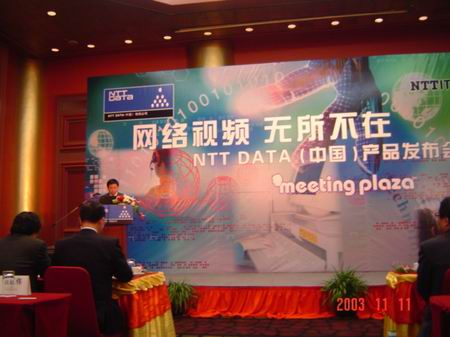2003年11月11日,NTT DATA(中國(guó))有限公司,在長(zhǎng)城飯店舉行了名為“網(wǎng)絡(luò)視頻——無(wú)所不在”的產(chǎn)品發(fā)布會(huì)。會(huì)上,NTT DATA(中國(guó))有限公司正式推出了一款網(wǎng)絡(luò)視頻軟件產(chǎn)品——“MeetingPlaza”。此產(chǎn)品開(kāi)拓了視頻系統(tǒng)在圖像效果、控制靈活度以及性價(jià)比上的全新應(yīng)用模式。該產(chǎn)品的開(kāi)發(fā)商N(yùn)TT-IT,自2001年6月起在日本開(kāi)始系統(tǒng)的銷售及提供ASP服務(wù)。到現(xiàn)在已經(jīng)向500家以上的日本企業(yè)及地方政府提供了服務(wù),在日本深受好評(píng)。在中國(guó),雖然軟件視頻會(huì)議系統(tǒng)還處在起步階段,但依據(jù)未來(lái)視頻通訊的廣大需求,以及“MeetingPlaza”具有的投入成本低、限制少和適用性強(qiáng)的特點(diǎn),都將使該產(chǎn)品更加具有市場(chǎng)潛力。