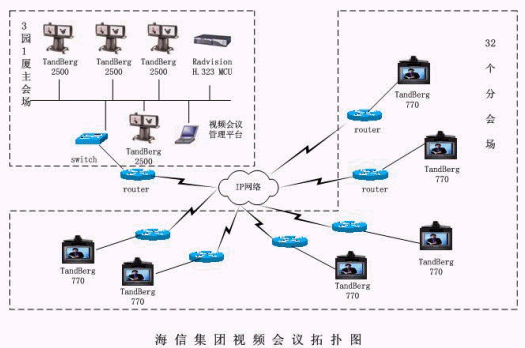 山東海信集團(tuán)有限公司會(huì)議電視項(xiàng)目以海信大廈為中心,覆蓋各個(gè)省的35個(gè)分支機(jī)構(gòu)。充分利用自己網(wǎng)絡(luò)資源的優(yōu)勢(shì),采用ITU(國(guó)際電聯(lián))的H。323標(biāo)準(zhǔn)。于-2004-年初經(jīng)過系統(tǒng)方案的征集、產(chǎn)品的反復(fù)測(cè)試,最終確定了由華夏科技代理的挪威TANDBERG的視頻終端,并于2004年6月份簽訂了一期采購(gòu)合同,共計(jì)36套視頻終端。