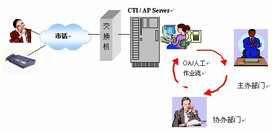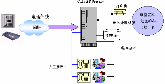 系統(tǒng)以計算機系統(tǒng)(CTI/AP Server)為核心,配備多功能呼叫中心卡及系統(tǒng)軟件。投訴人電話撥入時,由計算機提示語音指導(dǎo)操作過程,例如選擇留言、人工投訴或者傳真。如已經(jīng)有一套辦公自動化系統(tǒng)(OA),本系統(tǒng)可以和它連接(接口定制)使得投訴內(nèi)容自動進入OA流程;如果沒有OA系統(tǒng),則可以選擇將投訴內(nèi)容在打印機打印(表單)后進入人工投訴處理流程,再由人工將處理的結(jié)果人工輸入CTI/AP Server以供查詢;如果需要訪問其它網(wǎng)絡(luò)資源,本系統(tǒng)提供電子郵件及URL的網(wǎng)絡(luò)資源訪問手段,使您輕松訪問網(wǎng)絡(luò)資源。