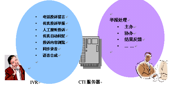 以CTI(計算機和電話集成)技術(shù)為系統(tǒng)核心,使投訴舉報人可以采用多種方式將信息轉(zhuǎn)達(dá)到相關(guān)部門設(shè)立的電話投訴舉報中心,待舉報處理完畢后收集處理結(jié)果并登記入數(shù)據(jù)庫,傳遞供各級領(lǐng)導(dǎo)處理。