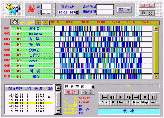 以時間為水平軸、分機(jī)號碼為垂直軸機(jī)制,錄音分布狀況一目了然。該窗口下,可經(jīng)由日期、分機(jī)之選擇、或客戶代號之輸入,輕松找到您要聽取錄音檔。您只要點(diǎn)取錄音棒的定點(diǎn),即得知錄音記錄清單,播放操作: