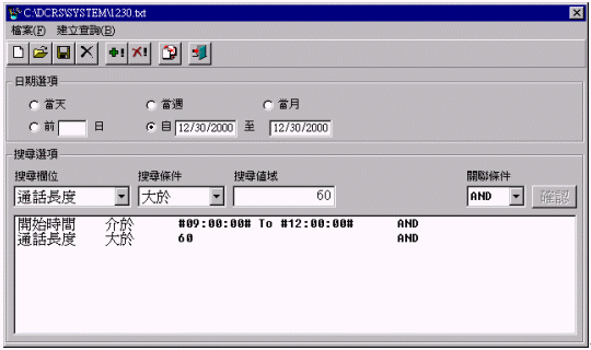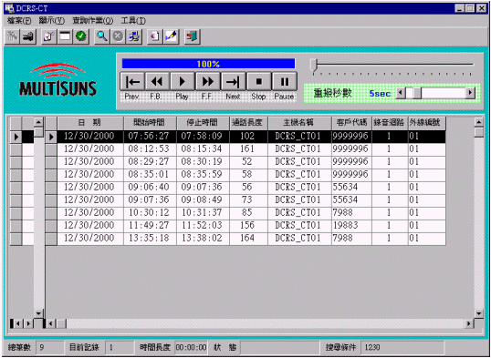 在錄音設(shè)備與用戶之程控交換機(jī)(PBX)整合條件下,DCRS CT Integra允許用戶以中繼線號碼、分機(jī)號碼、開始通話時間、通話長度、撥入電話、撥出電話、服務(wù)人員代碼、服務(wù)人員姓名、服務(wù)人員部門別、撥入群組代碼 (ACD Group ID)、撥號字符串、來話號碼(Caller ID)等等為收尋錄音資料條件。再依您需要找尋條件,重建單位內(nèi)部人員與外部人員雙方通話內(nèi)容就輕而易舉。舉例說,您可以在一瞬間就查詢到您所聘雇之客服員張小姐于過去一星期中接到某某公司李先生多少通電話,李先生是什幺時候打來的,張小姐每一通電話花多少時間去服務(wù)李先生,其講話的內(nèi)容又是什幺。