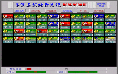 用鼠標(biāo)點(diǎn)取要聽取的分機(jī)狀態(tài)圖標(biāo),原圖標(biāo)會變成紅色監(jiān)聽圖標(biāo)(參看下圖第三行左邊第四個紅顏色"孫仲銳"圖標(biāo)),該回路通話聲音就會由喇叭播放出來。您坐在錄音系統(tǒng)前面而且擁有適當(dāng)監(jiān)聽操作權(quán)限,您可以自由、快速、沒有時間限制監(jiān)聽任何一支電話。假如您買的是網(wǎng)絡(luò)版系統(tǒng)、您的個人計算機(jī)是多媒體計算機(jī)并且已安裝有華鼎錄音系統(tǒng)遠(yuǎn)程工作站(DCRS Supervisor Workstation)軟件,您也可以在自己座位上執(zhí)行相同工作。