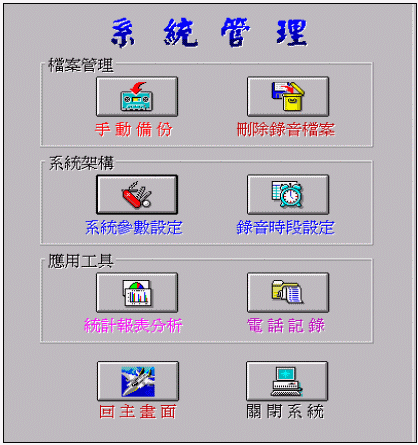 三個方塊區(qū):檔案管理區(qū)、系統(tǒng)架構(gòu)區(qū)和應(yīng)用工具區(qū)。各方塊區(qū)內(nèi)有其包含之功能指令。此外,"回主畫面"的功能鍵提供您可回到主窗口畫面的功能;"關(guān)閉系統(tǒng)"功能鍵則提供您正常操作關(guān)掉此錄音系統(tǒng)的功能。您不須依賴操作手冊,也不需要別人指導(dǎo),您就可以執(zhí)行一些系統(tǒng)維護(hù)設(shè)定功能。