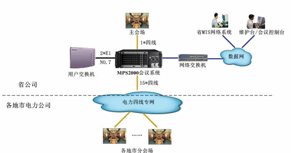該會議系統(tǒng)是安徽省公司與地市電力公司“一主兩備”系統(tǒng)的電話會議系統(tǒng)備份系統(tǒng),通過2個數(shù)字中繼與省通信公司用戶交換機互連,采用NO.7信令。16路4線中1路接主會場調(diào)音臺,實現(xiàn)會議室擴音設(shè)備的接入,其余15路接各地市電力公司原四線專網(wǎng)資源連接,通過以太網(wǎng)口與D-LINK網(wǎng)絡(luò)交換機互連,接入安徽省電力的數(shù)據(jù)網(wǎng),實現(xiàn)實時維護管理及會議控制等功能。