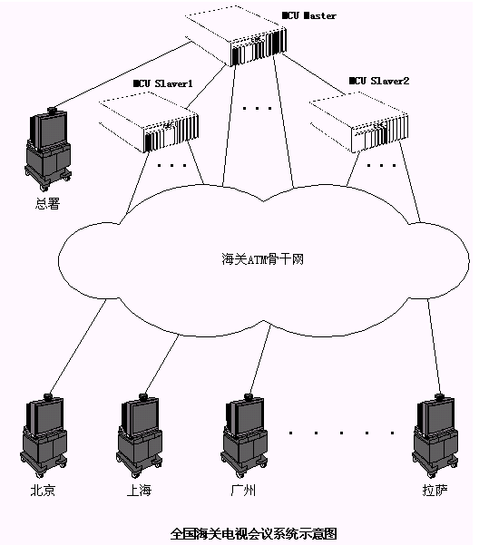 與海關(guān)ATM網(wǎng)一樣,海關(guān)電視會(huì)議系統(tǒng)也是以總署為中心的星形結(jié)構(gòu)?偸鹋渲糜腥齻(gè)相互級連的MCU,其中一個(gè)為Master,另外兩個(gè)為Slaver,分署和各海關(guān)的會(huì)議終端設(shè)備通過ATM網(wǎng)的PVC信道分別連接到Master或Slaver