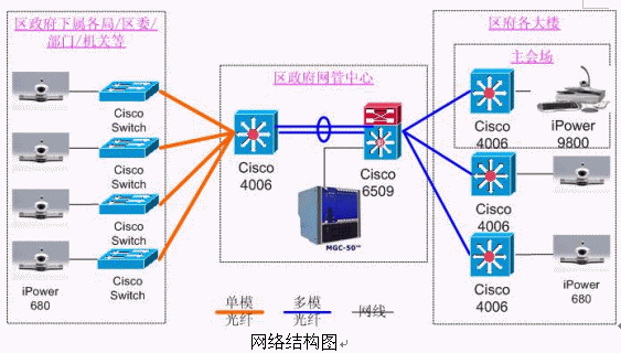 結(jié)合閔行區(qū)政府的網(wǎng)絡(luò)產(chǎn)品,本方案設(shè)計(jì)的視頻會(huì)議系統(tǒng)承載在閔行區(qū)政府的政務(wù)網(wǎng)平臺上,采用國際流行的ITU H.323通信標(biāo)準(zhǔn)。系統(tǒng)采用以MCU為中心輻射各個(gè)會(huì)場電視會(huì)議終端的星型網(wǎng)絡(luò)結(jié)構(gòu)。整套系統(tǒng)由20個(gè)會(huì)場組成,采用美國Polycom公司的iPower會(huì)議室型終端設(shè)備。主會(huì)場使用iPower 9800,分會(huì)場使用iPower 680。網(wǎng)管中心安放一臺Polycom 公司的MGC-50(多點(diǎn)會(huì)議控制單元),用于對全網(wǎng)終端的控制,實(shí)現(xiàn)多點(diǎn)間、點(diǎn)對點(diǎn)會(huì)議。各視頻設(shè)備通過網(wǎng)線連接在各主要交換機(jī)上。