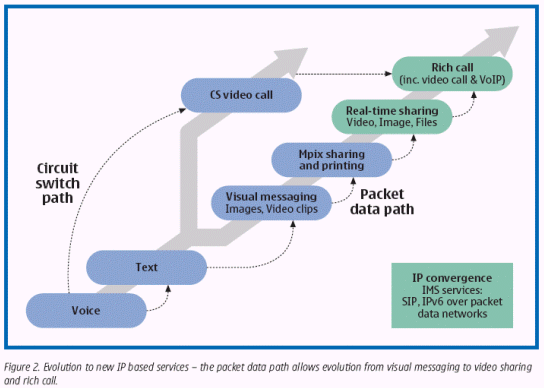 首個(gè)IP整合服務(wù)(例如視頻共享和內(nèi)容共享)是向豐富的通話方式發(fā)展的關(guān)鍵。這是一個(gè)以語(yǔ)音、視頻和文本為形式的基于會(huì)話通訊的概念,它支持在會(huì)話參與者之間共享相同的內(nèi)容,例如圖片、數(shù)據(jù)和其它增值信息。