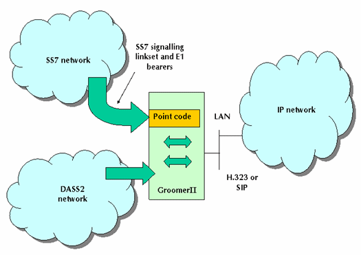 如上所述,GrommerII可以安裝不同的協(xié)議軟件。圖2中的系統(tǒng)配備了SS7和DASS2的GrommerII,擔(dān)當(dāng)與IP網(wǎng)絡(luò)相連的網(wǎng)關(guān),完成IP呼叫。