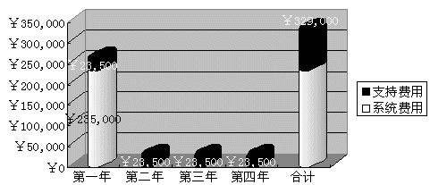 2) 語音合成投入費用 科大訊飛公司語音合成技術(shù)以及硬件設(shè)備的折舊期為四年,而就經(jīng)過大量統(tǒng)計所得到的數(shù)據(jù)證明,采用語音技術(shù)后的一個72線的IVR系統(tǒng),大約可以完成一個中型的呼叫中心(配備100座席人員)所能提供的60%的業(yè)務(wù)。下圖為采用訊飛語音合成技術(shù)建設(shè)這樣的IVR系統(tǒng)的投入。