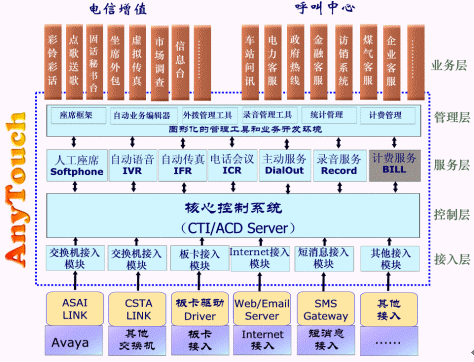 佳訊飛鴻近十年來(lái)一直致力于建設(shè)國(guó)內(nèi)一流的呼叫中心系統(tǒng)和電信增值業(yè)務(wù),其CTI方面的主打產(chǎn)品AnyTouch平臺(tái)廣泛應(yīng)用到電信、鐵路、軍隊(duì)、郵政、媒體、政府、電力、金融和商業(yè)等多個(gè)行業(yè)的呼叫中心、客服中心、CRM、電子商務(wù)和信息化平臺(tái)項(xiàng)目建設(shè)中。AnyTouch平臺(tái)是融合呼叫中心和電信增值業(yè)務(wù)的CTI應(yīng)用產(chǎn)品,是一個(gè)綜合的、集成的開(kāi)發(fā)工具。她能夠構(gòu)建各種熱線(xiàn)電話(huà)系統(tǒng)、客戶(hù)服務(wù)系統(tǒng)、企業(yè)服務(wù)中心等呼叫中心業(yè)務(wù);同時(shí)可生成彩話(huà)、點(diǎn)歌、固話(huà)秘書(shū)臺(tái)、信息臺(tái)等電信增值業(yè)務(wù)。