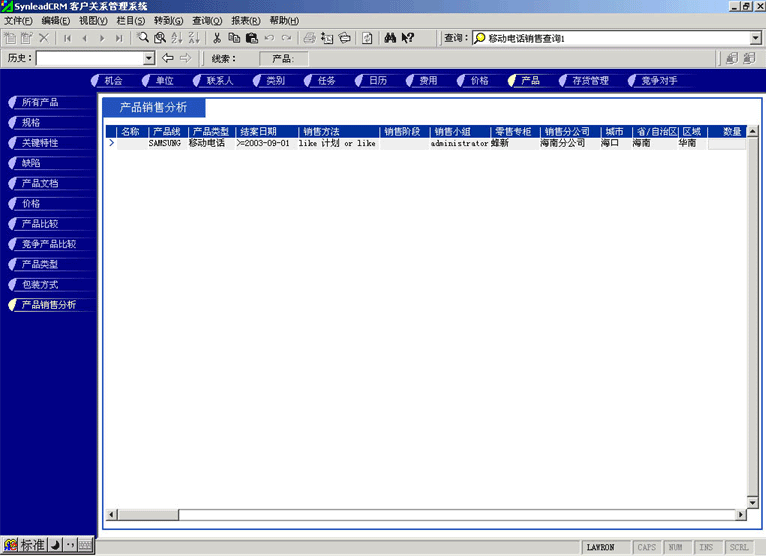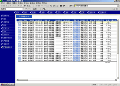 管理人員可能需要對(duì)比產(chǎn)品銷(xiāo)售計(jì)劃與實(shí)際銷(xiāo)售的產(chǎn)品數(shù)量的關(guān)系,也有可能要對(duì)比某款產(chǎn)品與競(jìng)爭(zhēng)產(chǎn)品銷(xiāo)售的情況,這時(shí)候可以利用產(chǎn)品銷(xiāo)售統(tǒng)計(jì)功能。它最大的好處是各項(xiàng)目數(shù)據(jù)普遍關(guān)聯(lián),允許任意組合查詢條件(見(jiàn)圖4,點(diǎn)擊下圖,可彈出更清晰的大圖)