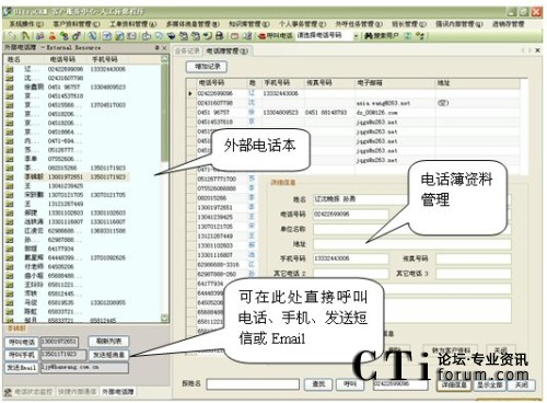 其所有資料顯示在主界面右側(cè)的“外部電話本”中。在轉(zhuǎn)發(fā)工單等功能中也將使用外部電話簿資料。如圖所示: