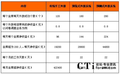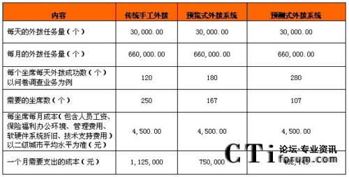 從上表可以看出,在同等每天3萬個呼叫任務(wù)的情況下,由于使用預(yù)測式外撥系統(tǒng)使得效率提升,所需人員數(shù)比預(yù)覽式外撥方式少用60人,比傳統(tǒng)手工外撥人員數(shù)量減少一半多,省的費用也相當可觀。
