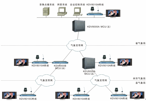 目前,一期工程已完成省到地市的建設(shè),系統(tǒng)設(shè)備全部基于科達(dá)KDV系列視頻會(huì)議產(chǎn)品。省氣象局部署KDV8000A多點(diǎn)控制單元1套,負(fù)責(zé)整個(gè)視訊網(wǎng)絡(luò)的交換和管理;省氣象局預(yù)報(bào)會(huì)商室與各州市氣象局預(yù)報(bào)會(huì)商室各部署KDV8010A高清視頻會(huì)議終端1臺(tái),提供本地會(huì)場(chǎng)視音頻信號(hào)的接入。州市氣象局的視頻會(huì)議終端通過氣象寬帶網(wǎng)接入省氣象局的多點(diǎn)控制單元。其中,KDV8010A支持H.239雙視頻流功能,可同時(shí)接入會(huì)議攝像機(jī)和電腦VGA信號(hào),并可同時(shí)輸出視頻信號(hào)和VGA信號(hào)到電視機(jī)和投影儀,實(shí)現(xiàn)與會(huì)者圖像和輔助視頻圖像的同時(shí)傳輸。